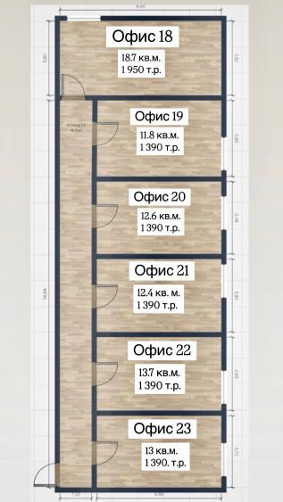 Офис 19 (11,8 кв м)- 1 390 тр, Офис 20 (12,6 кв м)- 1 390 тр, Офис 21 (12,4 кв м)- 1 390 тр, Офис 22 (13,7 кв м)- 1 390 тр, Офис 23 (13 кв м)- 1 390 тр, Офис 18 (18,7 кв м) -1 950 тр.