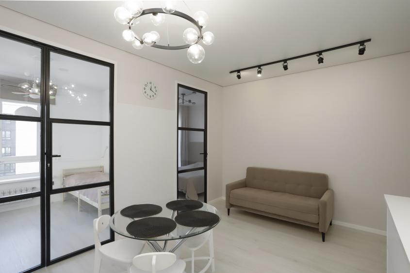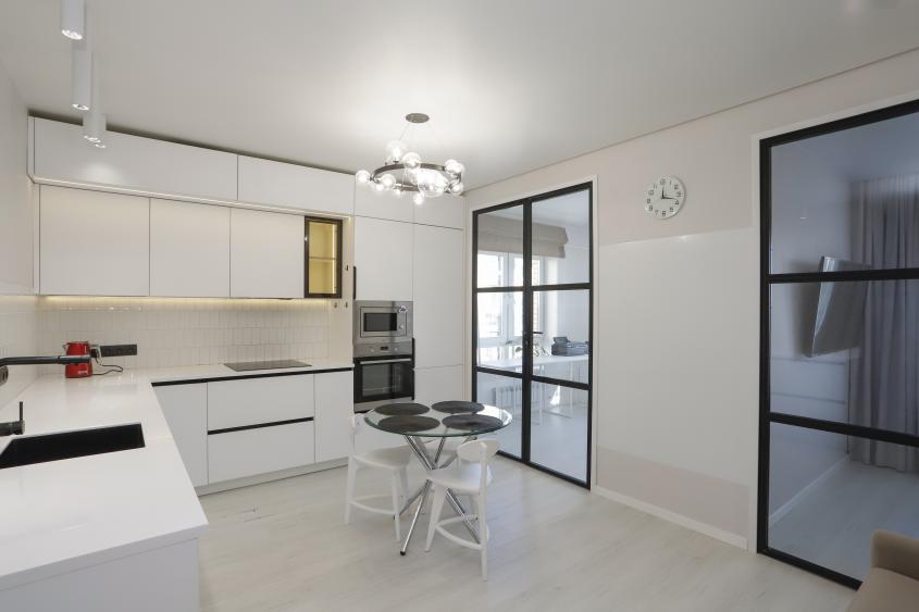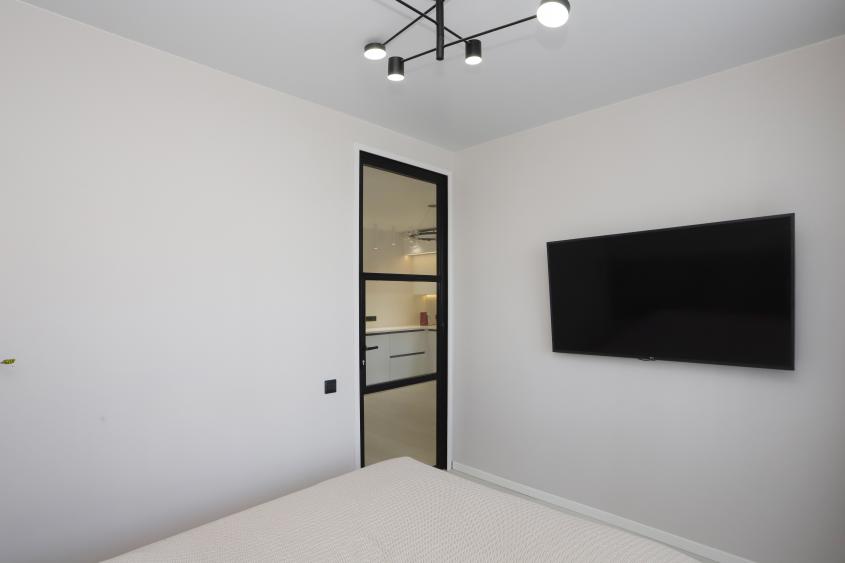 Т. к. планировка была свободная, сделали 2-е комнаты, отдельную кухню и гардеробную, планировка размещена в фотографиях. В квартире выполнен дизайнерский ремонт. Состояние отличное.