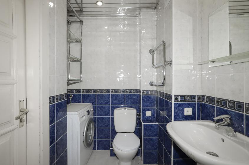 - В санузле на полу и стенах- кафельная плитка, хороший санфаянс.