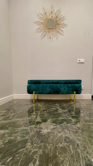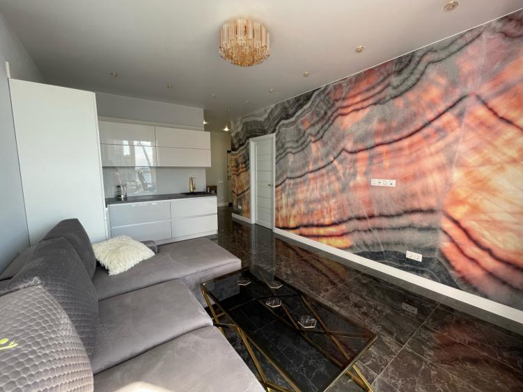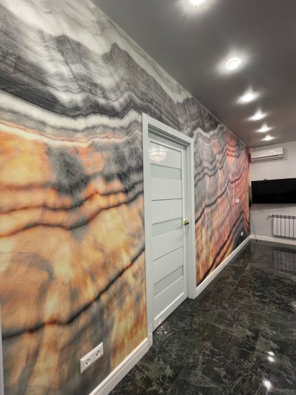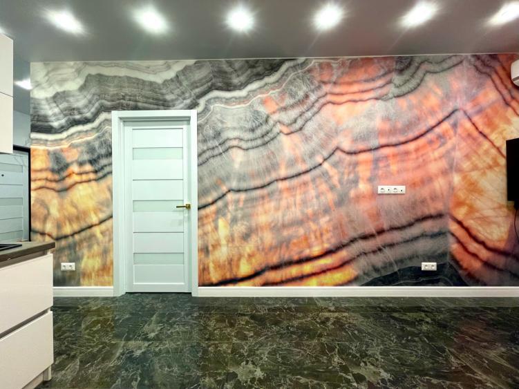 - Гостиная: итальянская фреска из оникса с частицами фосфора, меняющая цвет в зависимости от освещения — настоящий художественный акцент, который преображает пространство в любое время суток.