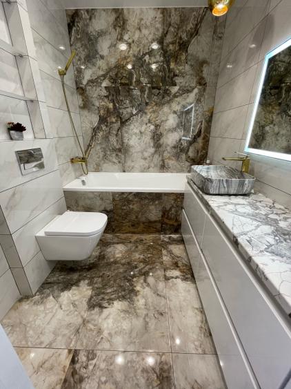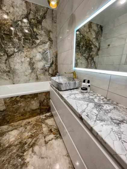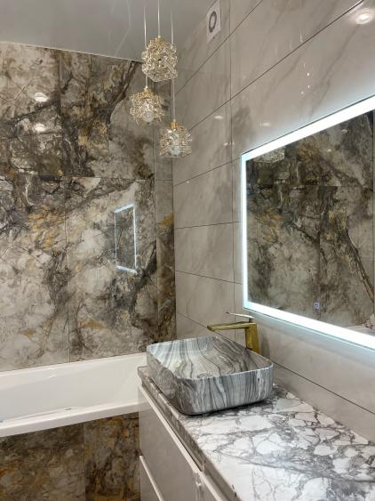 - Полы: широкоформатная плитка антрацит с лапотированным полированием и глазурью — изысканная текстура, подчеркивающая глубину цвета. Тёплый пол по всей квартире — уют без компромиссов.